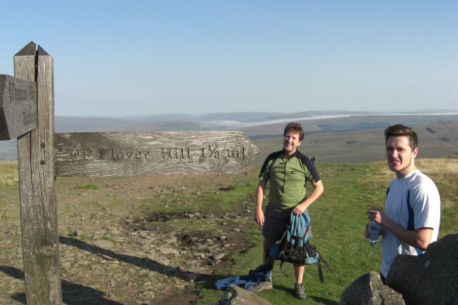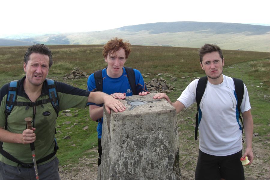 Tony and Joe on the summit. The mist is clinging to the River Ribble in the valley below