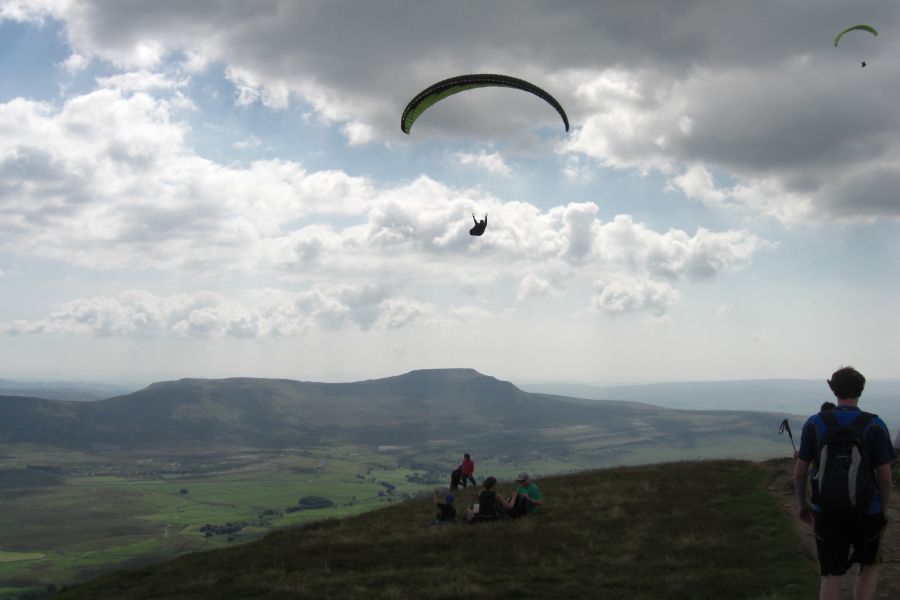 Setting off to Ingleborough with hangliders above us.