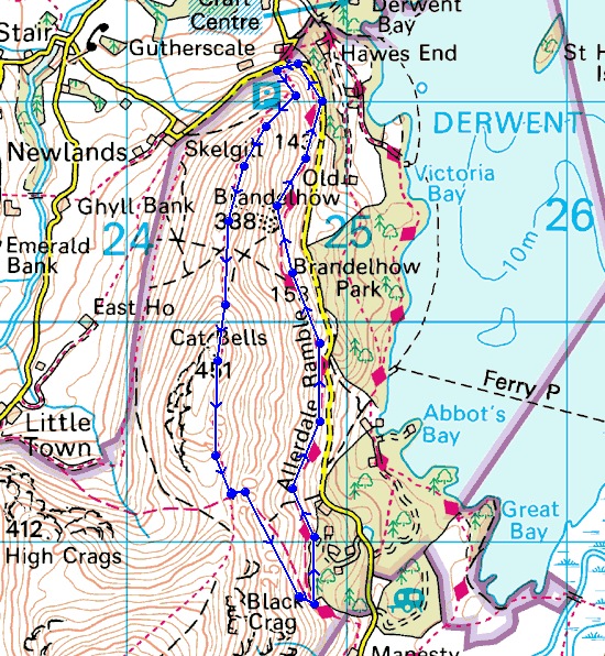 directly below Black Cragg, this broad track skirts Derwent Water on