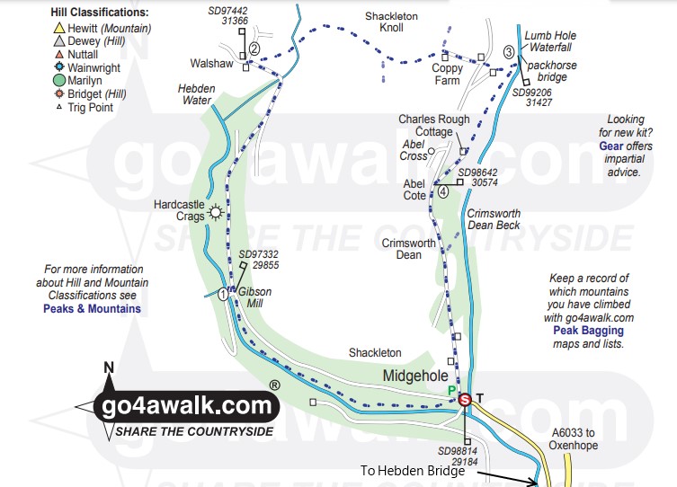 Route detail for this great walk There is a map at the bottom of the description This Fabulous 5 and a half mile walk starts at the National Trust Car Park on Midgehole Road at Hebden Bridge. Postcode to use for Sat Nav is HX7 7AA, this takes you on to Midgehole Lane, The car park is at the end of the road, about half a mile along. It costs £5 a day to park unless you are a member of The National Trust, in which case it is free. Be aware this car park fills up very quickly at weekends. Look to get there before 10 am to be sure of finding a parking space. From the car park walk back to the road and pick out the footpath sign that points you towards Gibson Mill, drop down to the The River (Hebden Water and turn right (upstream), after a short distance you will see a path with stone steps heading straight down to the river bank. Take this and meander superbly along a narly, rocky root strewn path that is just superb as it follows the river. The way is marked with red and white footpath markers. Just keep the river on your left and you cant go wrong. You will soon arrive at Gibson Mill, stop here for an ice cream, tea or coffee or just a have a sit down. There are also toilets here. Continue past the mill, don’t go over the bridge. At the rear of the mill you will see the old Mill Pond, great for a photo on a nice day. Continue on past the pond and you soon approach Hardcastle Crags on your left. A signpost points up a track towards the top of the crags. Definately worth going up, the path bears right and slowly climbs the rocky path to the top of the crags. A panoramic view of the valley awaits. The way down the other side is pretty steep and requires some scrambling. Alternatively, retrace your steps back to the main path and turn left. Back on the main path, continue past the crags on your left, shortly the path forks, take the right fork and head steadily uphill and out of the woods. This path meets anther track merging from the right, continue straight on and you will soon cross a steam via a bridge with a low stone wall on either side. Continue on until you reach the small hamlet of Walshaw, just before the hamlet and pretty much level with farm buildings on your left take a sharp right turn (almost doubling back), through a field gate and head on up the track and recross the stream you crossed a few minutes ago. Through a gate on the other side of the steam and then gently upwards following the stone wall on your left. The hill on your left is Shackleton Knoll and after about 15 minutes of walking a gate takes you through the wall, the path continues in the same direction with the wall now on your right. The path now starts to descend with a ruined farmhouse on your right before reaching another at the bottom were a track runs from right to left. Turn right and immediately left down a rugged path towards Crimson Dean Brook. This rocky path drops steeply passed more ruins before meeting another path coming from the right. Here go left and within two minutes you will be at the wonderful Lumb Hole Waterfall. A great place to stop for your picnic, or even take a dip in the pool below the waterfall. After admiring the scene retrace your steps back to were the path you just came on goes back uphill, don’t go uphill but go straight on the bracken (If it’s summer) following the clear and rugged path as it contours the hill side above the Brook. The path passes to the right of a stone cottage, (big cottage) to meet the access track to this remote house. Follow this up, quite steeply to meet another track coming from the right. Continue straight on and now steadily downhill all the way back to the car park. ![]() Image is courtesy of www.go4awalk.com I subscribe to this site.. It's well worth it. Back to top of page